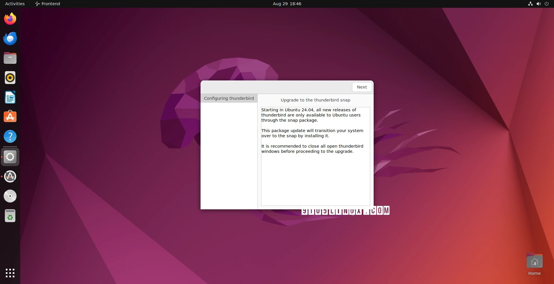 В этот раз в процессе обновления вы получите ещё одно уведомление: дело в том, что почтовый клиент Mozilla Thunderbird в Ubuntu 24.04 LTS переезжает с нативного для семейства Debian/Ubuntu формата DEB на Snap-пакеты.